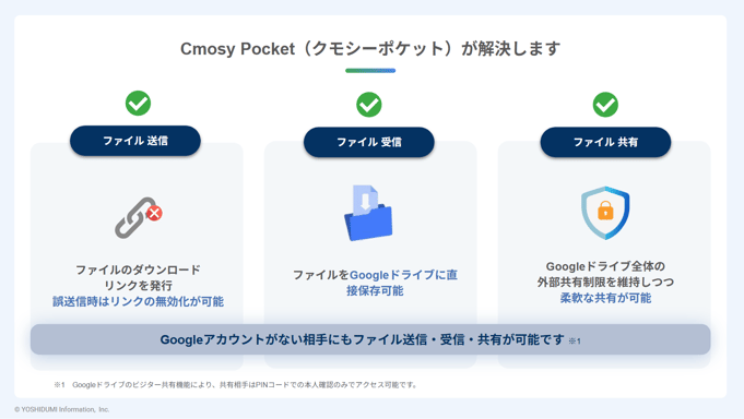 吉積情報では外部共有が制限されたGoogleドライブでも安全にファイル送付・共有ができる「Cmosy Pocket(クモシーポケット)」を提供しています。WEBアプリケーションですがスマートフォンにも対応しています。ファイル便という機能ではGoogleアカウントを持っていない外部ユーザーに対してもセキュアにファイル転送をすることができます。共有便という機能では指定した共有ドライブ内で、外部ユーザーと共同編集をすることもできます。
