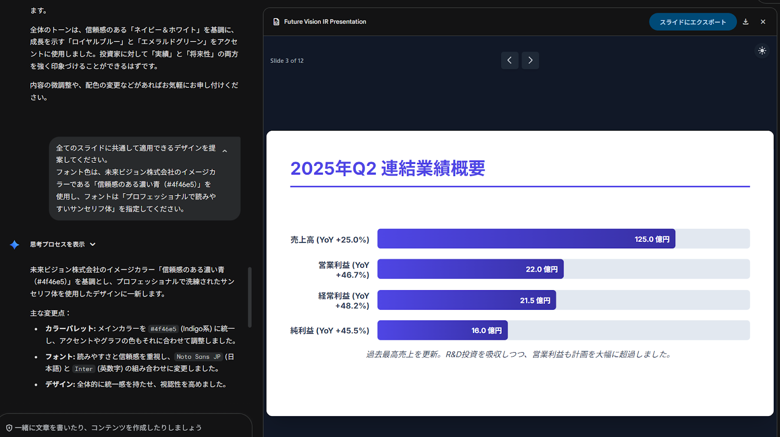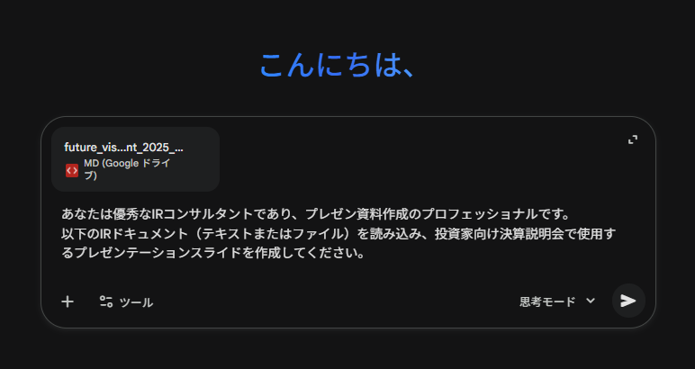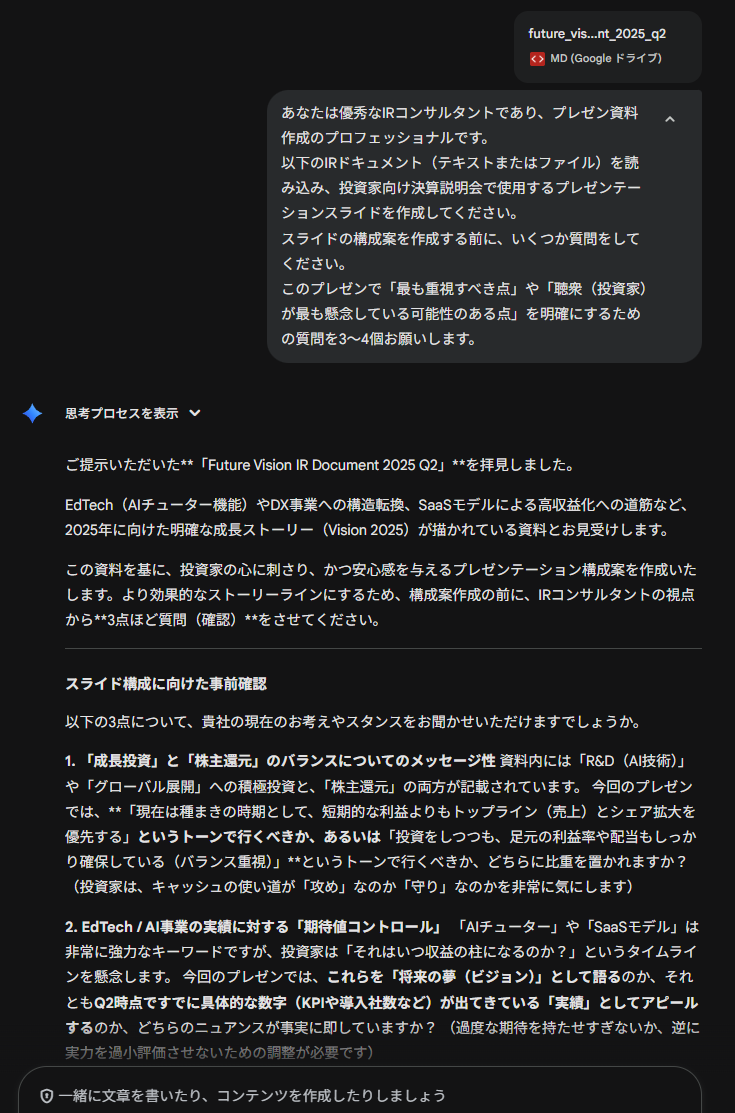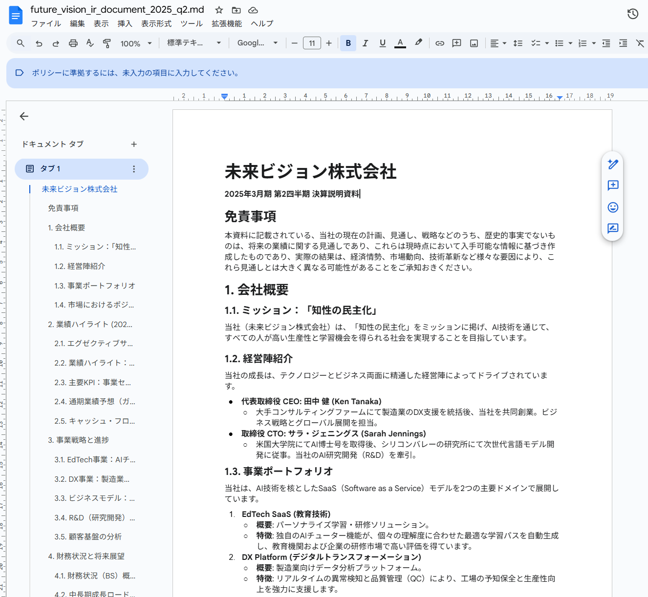 今回はデモとして、この架空のIRドキュメント(future_vision_ir_document_2025_q2.md)を元に、投資家向けの説明会スライドを作成していきます。