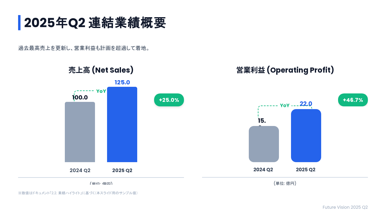 特に構成案の「Slide 3: 2025年Q2 連結業績概要」スライドにグラフを作成したいです。ドキュメントの「2.2. 業績ハイライト:売上高・営業利益の推移」の表データを使ってください。売上高と営業利益の推移が視覚的にわかる「棒グラフ」を作成してください。前年同期比(YoY)の成長率も明確に示してください。そして全部まとめて1つのHTMLスライドに生成してください。