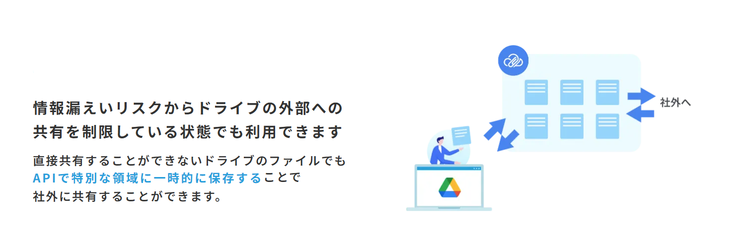直接共有することができない Google ドライブのファイルでも、APIで特別な領域に一時的に保存することで社外に共有することができます。