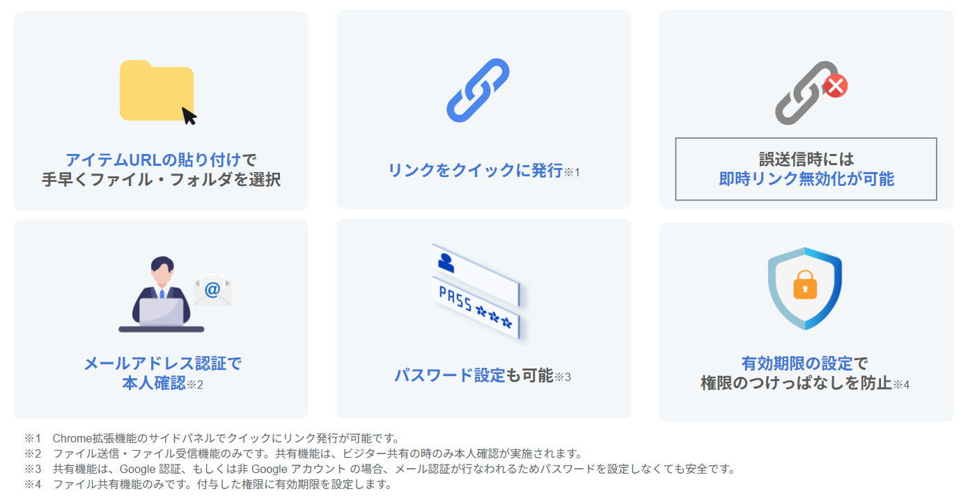 Google アカウント(Gmail)を持っていない取引相手にファイルを共有する場合は、パスワードや期限をつけて送付・受け取ることが可能です。